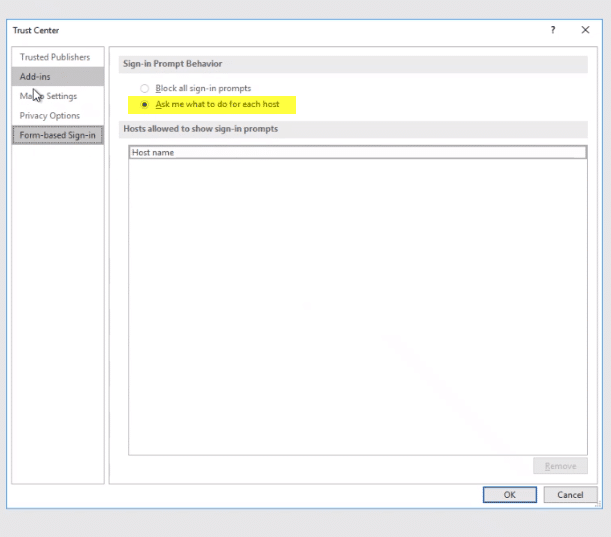 The process the user will need to complete is to open the trust center and choose the option to prompt and permit for each host.