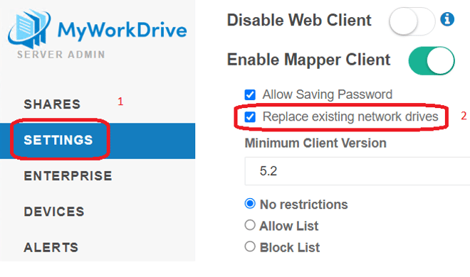 If the Replace existing network drives option is enabled under Enable Mapper Client Options in the MyWorkDrive Admin Panel (on the MyWorkDrive server), logging into the MyWorkDrive client will automatically disconnect any existing mapped drives and replace them with MyWorkDrive mappings. This ensures users have a consistent drive letter experience across all locations.