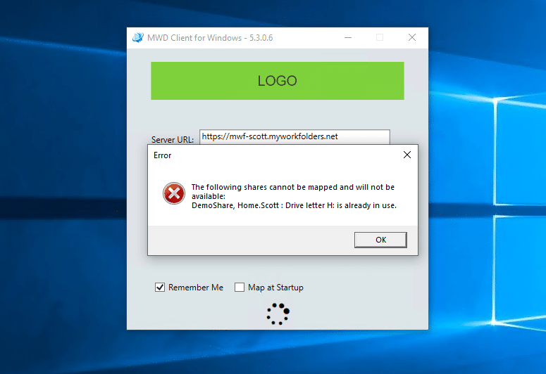 If the server assignment specifies a drive letter which is already locally in use, the mapped drive client will display a message about the share in question and will not map it. The user may be able to address the issue (remove the portable storage, unmap the drive) or may need to contact the administrator for assistance (if their login script specifies a conflicting drive mapping, for example).