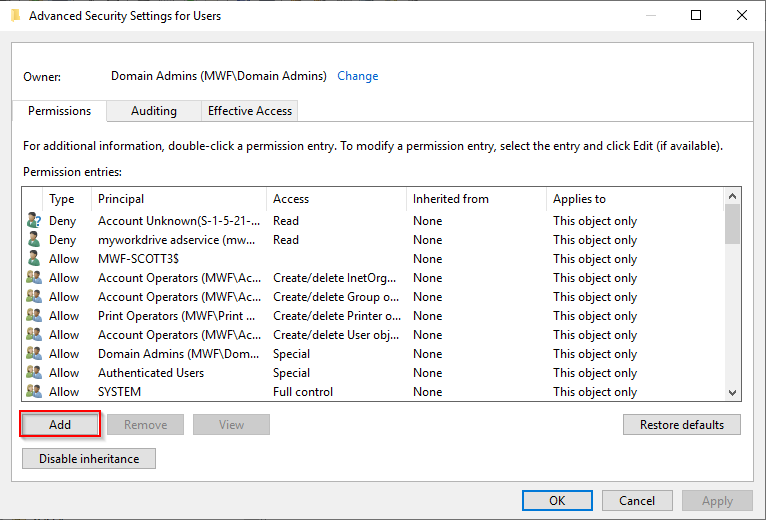 We recommend that you do not disable the Pre-Windows 2000 group. However, if you must disable this group for any reason, grant the Read Remote Access Information permission to the Computer Account for the Windows Server(s) MyWorkDrive is installed on in AD for the relevant users/user groups/OUs.