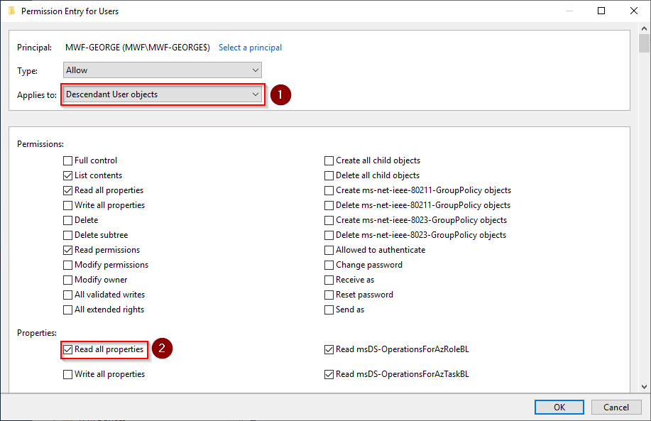 Select "Descendant User Objects" under "Applies To". Make sure "Read all properties" is selected. Select "OK" in the remainder of the menus.