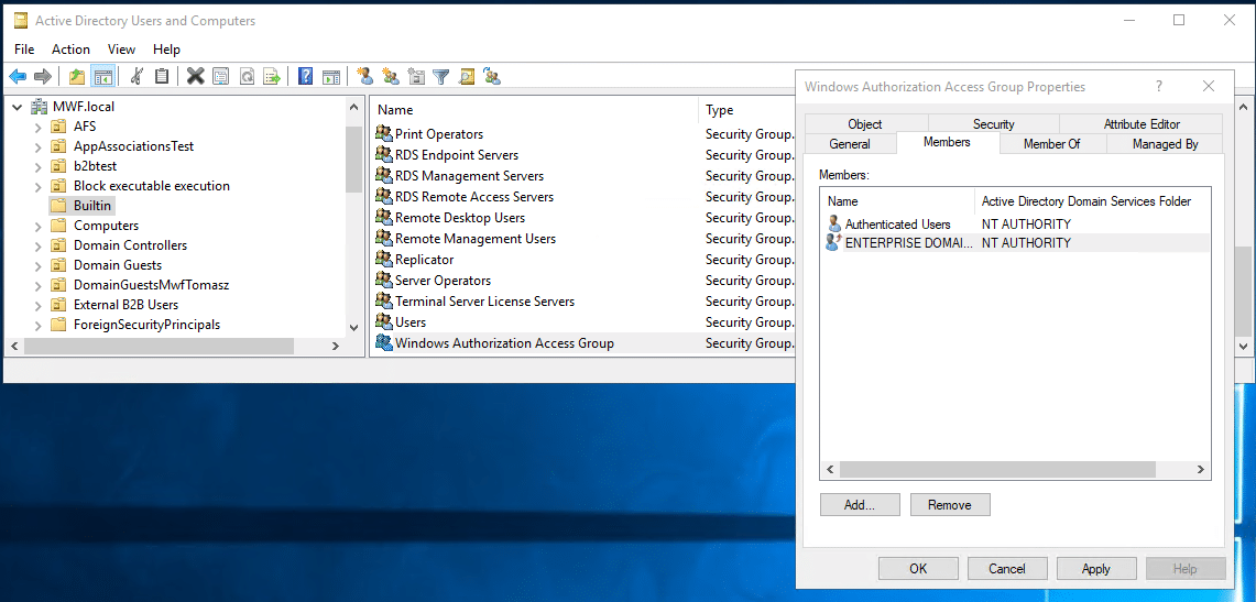 Add-ADGroupMember -Identity "Windows Authorization Access Group" -Members "MWDServer$"