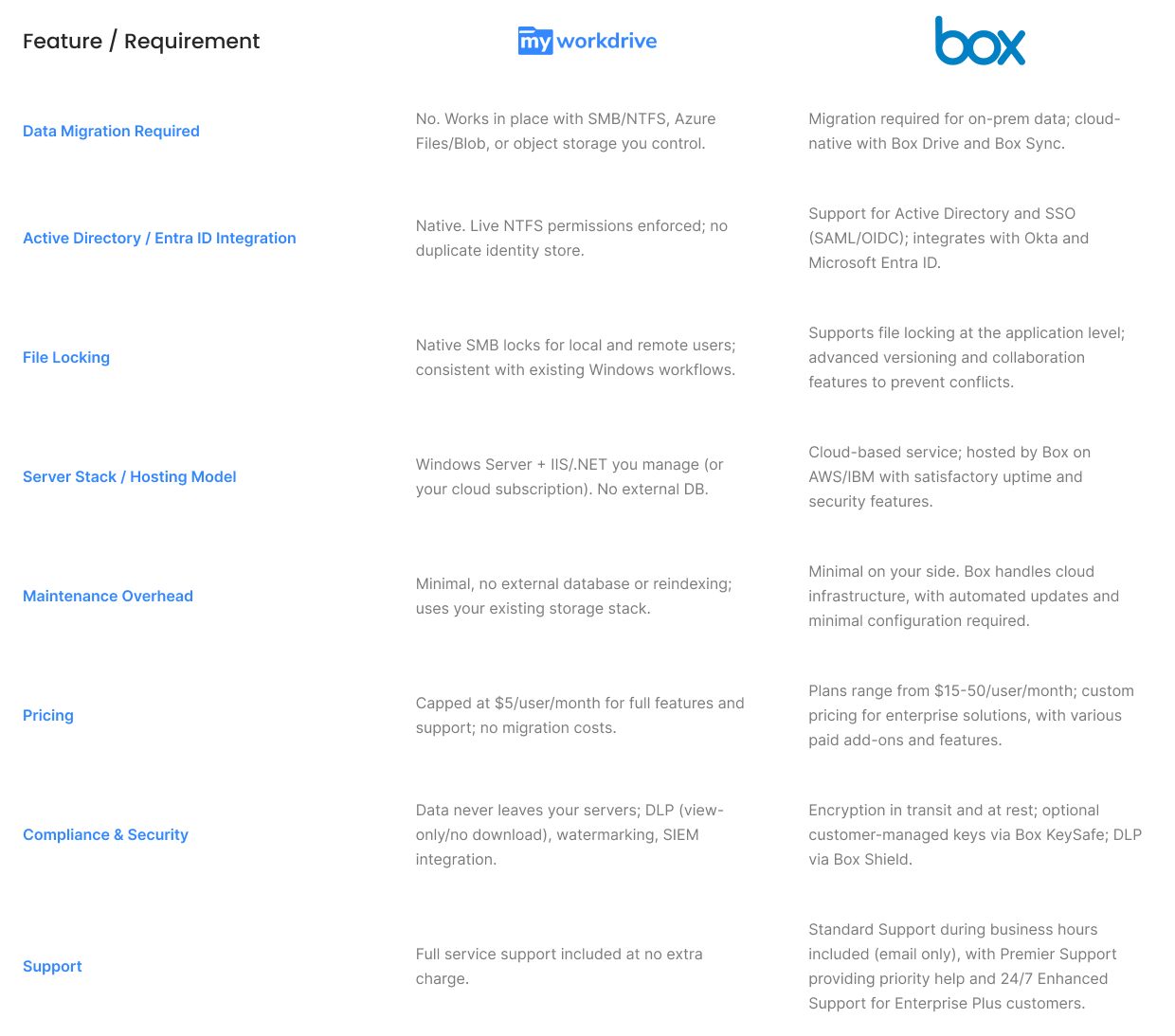 - Box: Fully managed cloud service. No server maintenance or backups required, but it depends on your Box subscription and usage for data retention, archiving, and recovery capabilities.