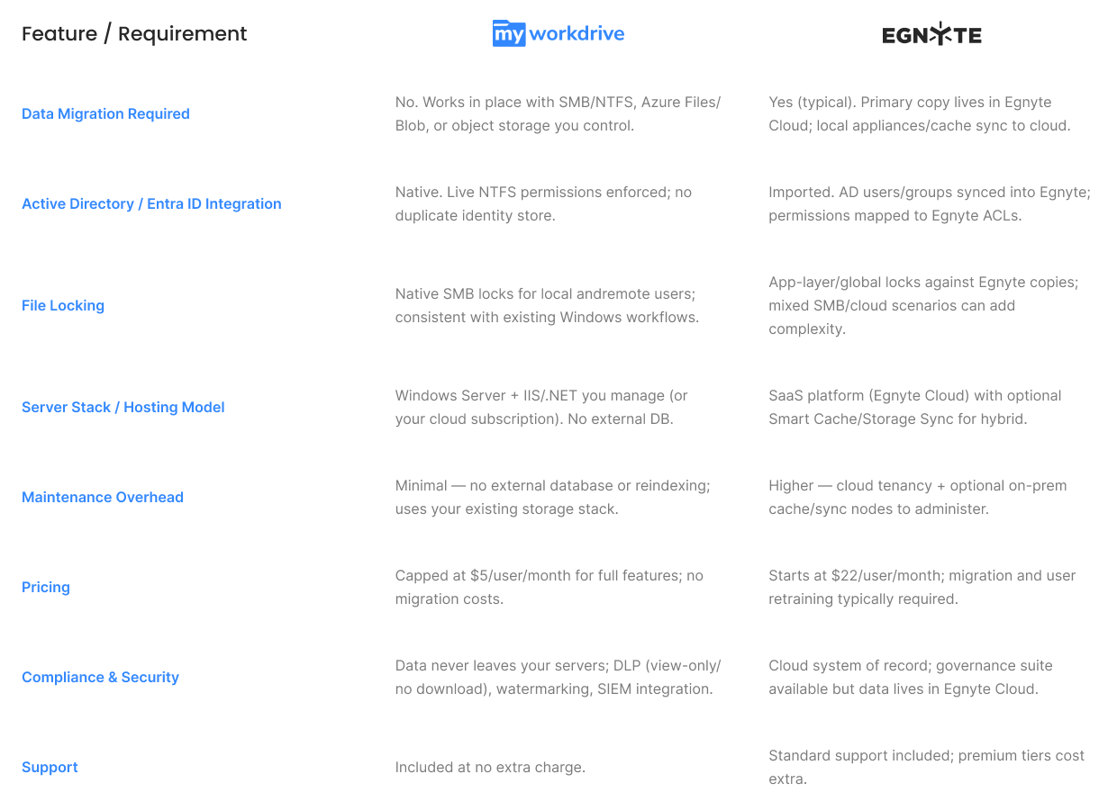 - Egnyte: SaaS tenancy + optional on-prem caches to manage; data lifecycle and retention shift to Egnyte’s cloud.