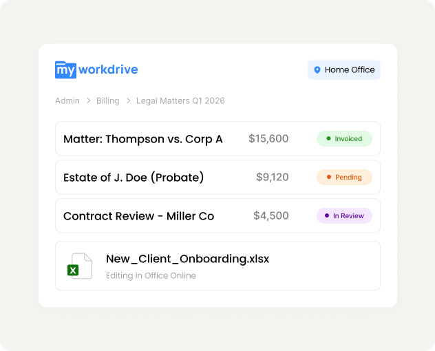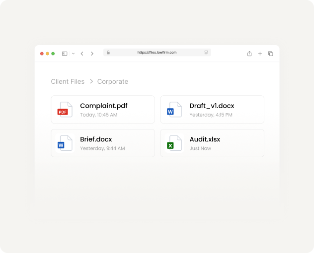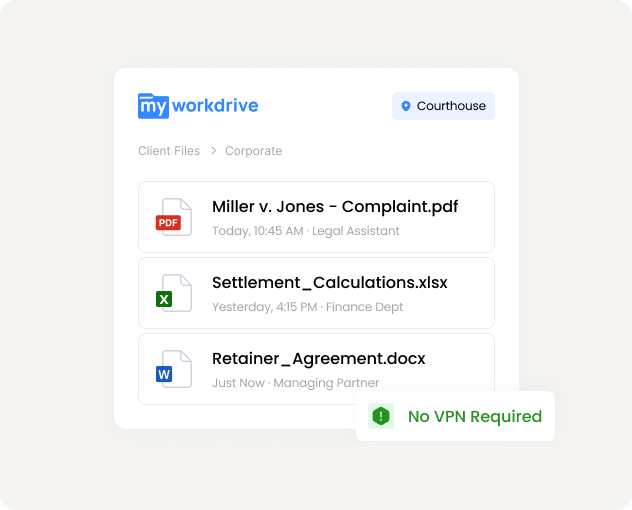 Familiar mapped drive access to billing, intake, and administrative files. Works with existing legal software. No VPN required from home or satellite offices.