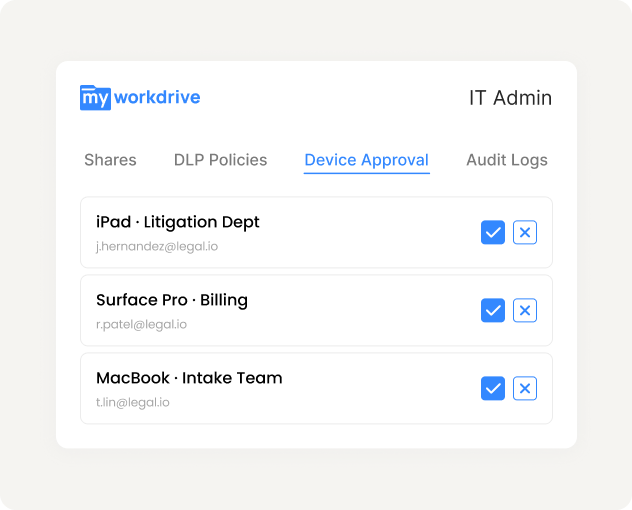 Device approval policies for mapped drive and mobile clients. Revoke access for lost or stolen devices instantly. Unknown devices blocked.