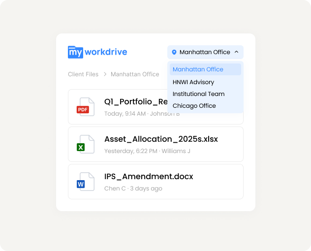 MyWorkDrive gives IT and compliance one audit trail across every storage system in your environment. Files stay on your infrastructure. Access is logged end to end. No VPN. No migration. No vendor cloud holding client data.