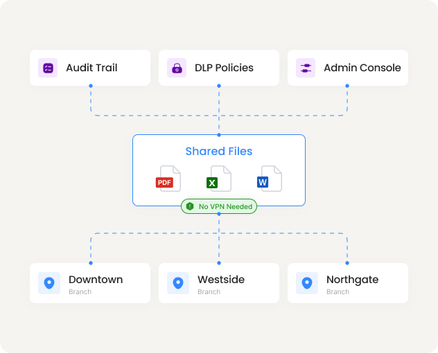 Branch staff access shared files without VPN. Every location covered by one audit trail, one set of DLP policies, and one admin console.