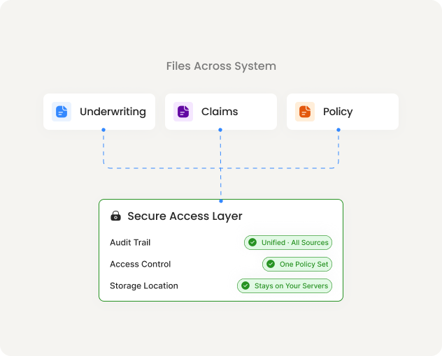 Underwriting, claims, and policy files scattered across offices and storage systems. One secure access layer with a unified audit trail across all of it.