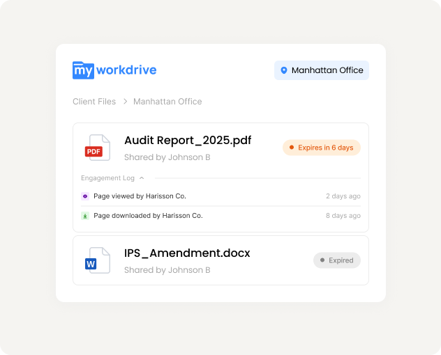 Client workpapers stay on your servers. Share with clients through controlled, expiring links. Every view and download logged for engagement documentation.
