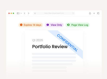Sends quarterly portfolio review to client. View-only, watermarked, expires in 14 days. Every page view logged.