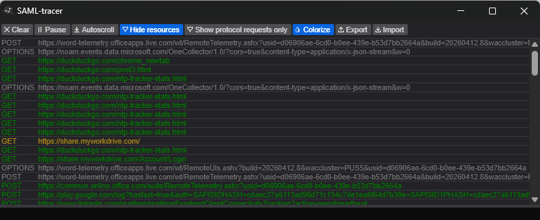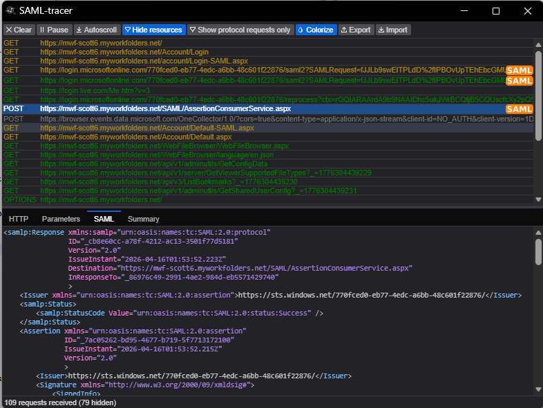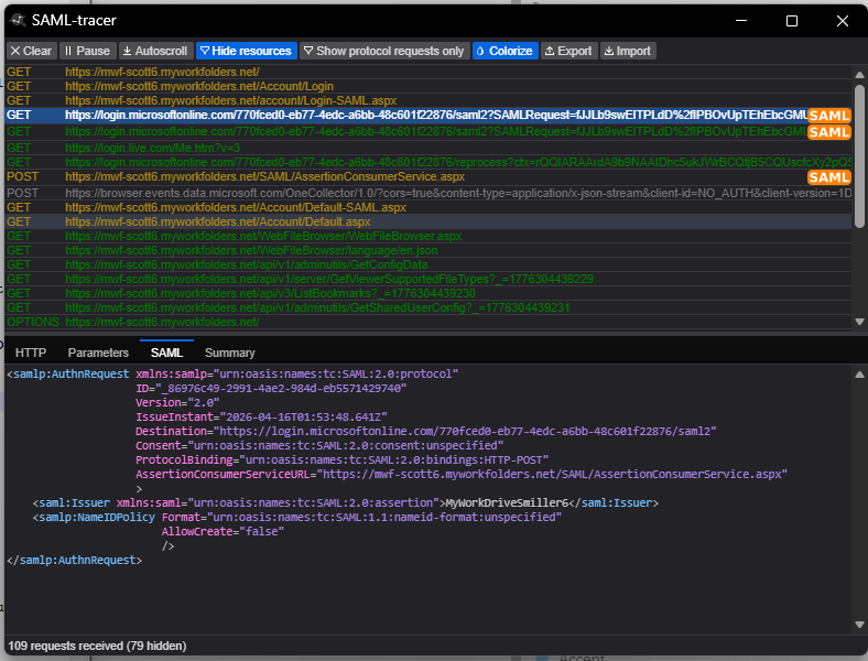 - Allow the full authentication flow to complete or fail. Do not close the SAML Tracer window until the final result (success or error) appears in the browser.