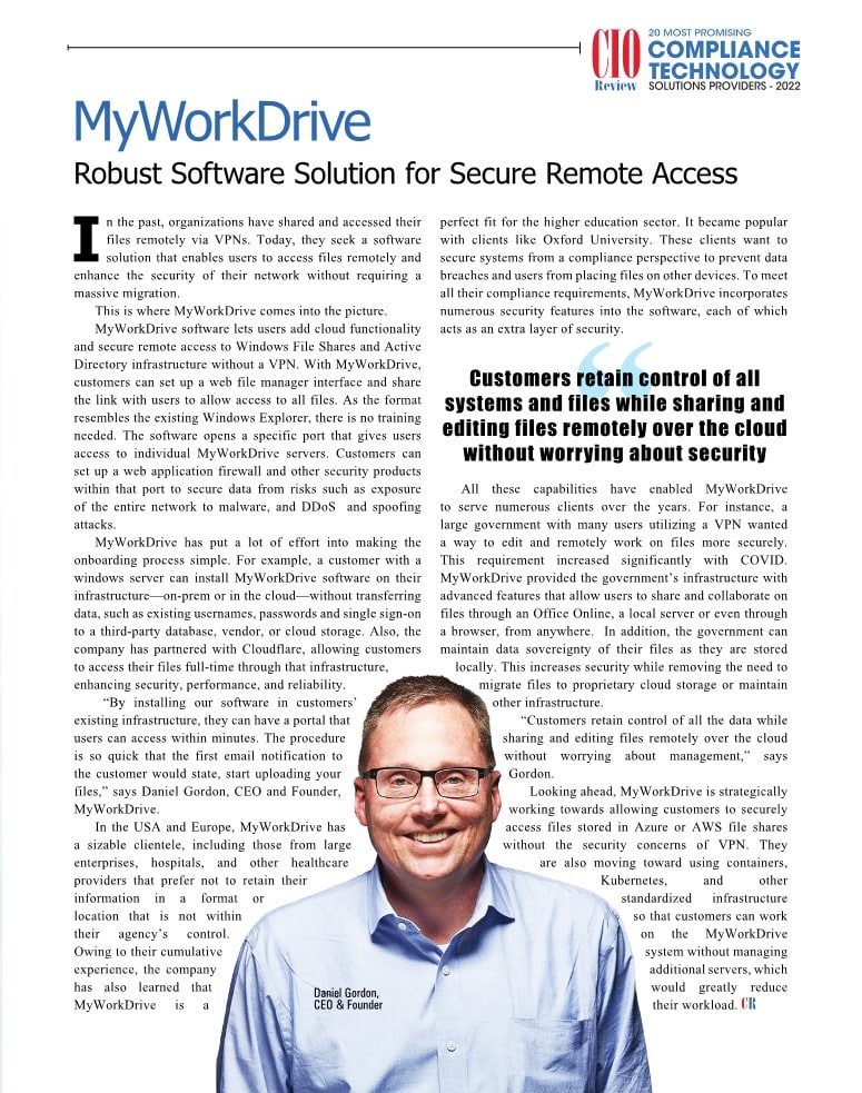 CIO Review, a highly respected publication, has awarded MyWorkDrive the the Most Promising Technology Solutions Provider 2022 certificate in their latest Compliance Technology Edition of CIO Review magazine.