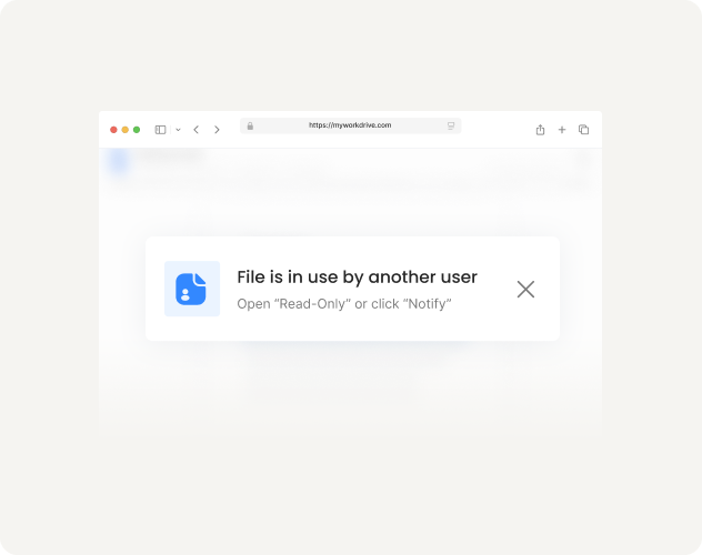 When someone opens a file for editing, MyWorkDrive locks it on the source storage. Users editing in desktop Office see a "file in use" message. Users in Office Online can co-author together.