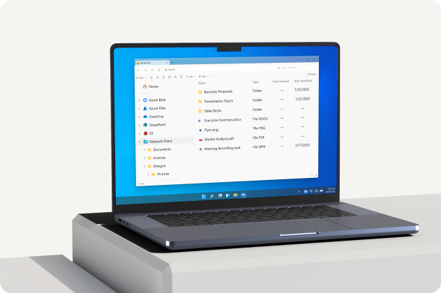 Windows and macOS drive letter that looks and works like a local network share. Existing scripts, shortcuts, and Save As workflows work without changes. Native file locking with SMB. Users see the same folder structure they already know.
